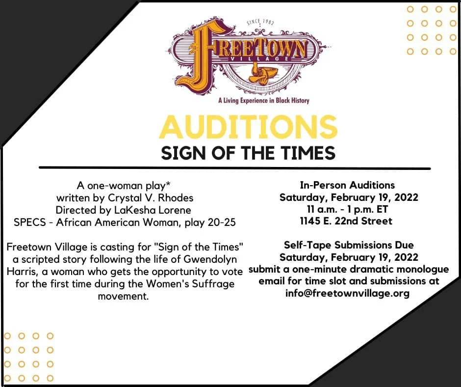 We are holding auditions for “Sign of the Times”a scripted one-woman story following the life of Gwendolyn Harris, a woman who gets the opportunity to vote for the first time following the passage of the 19th Amendment.